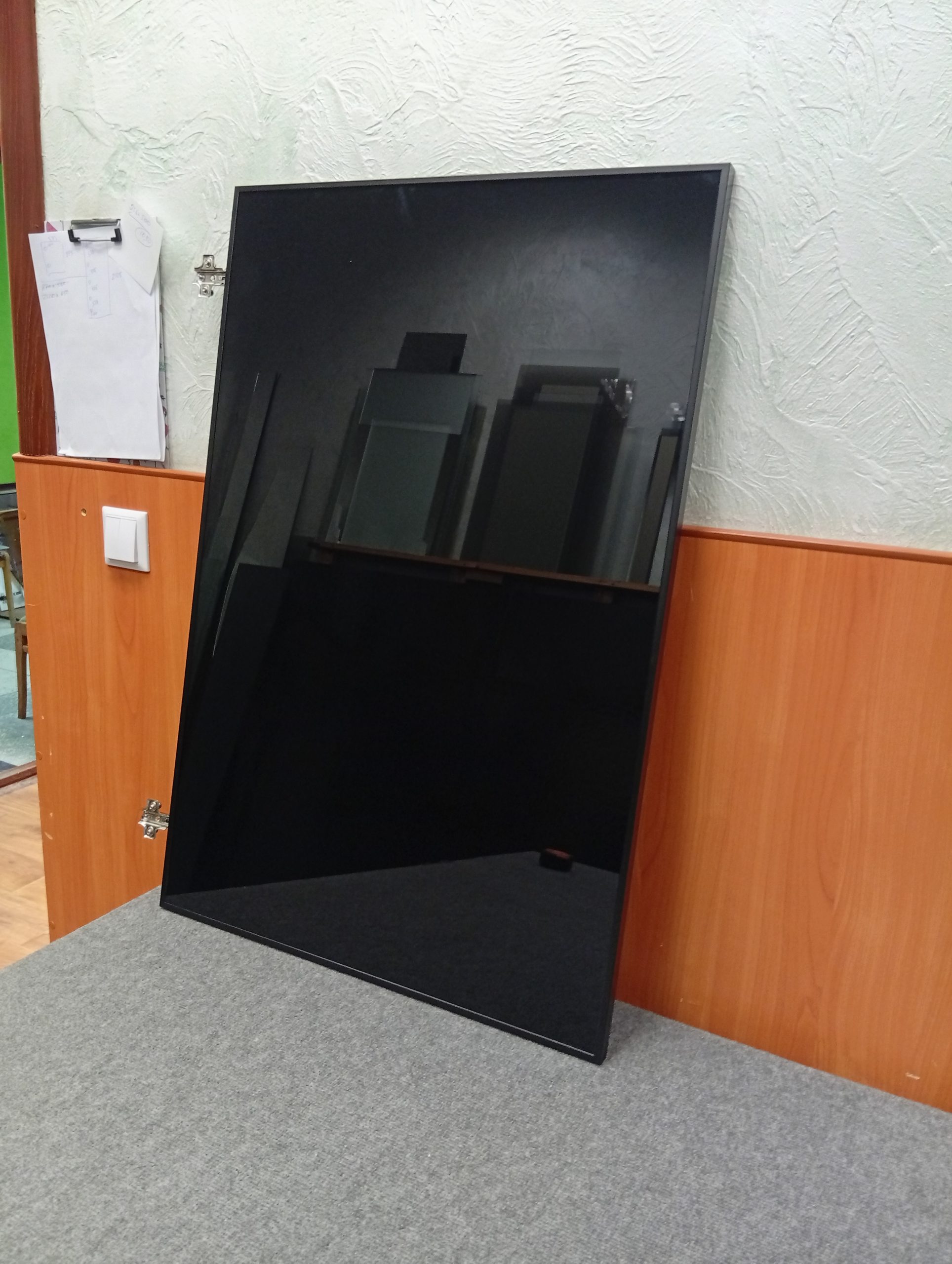 Из алюминиевого профиля «шампань» со стеклом лакобель чёрного цвета.