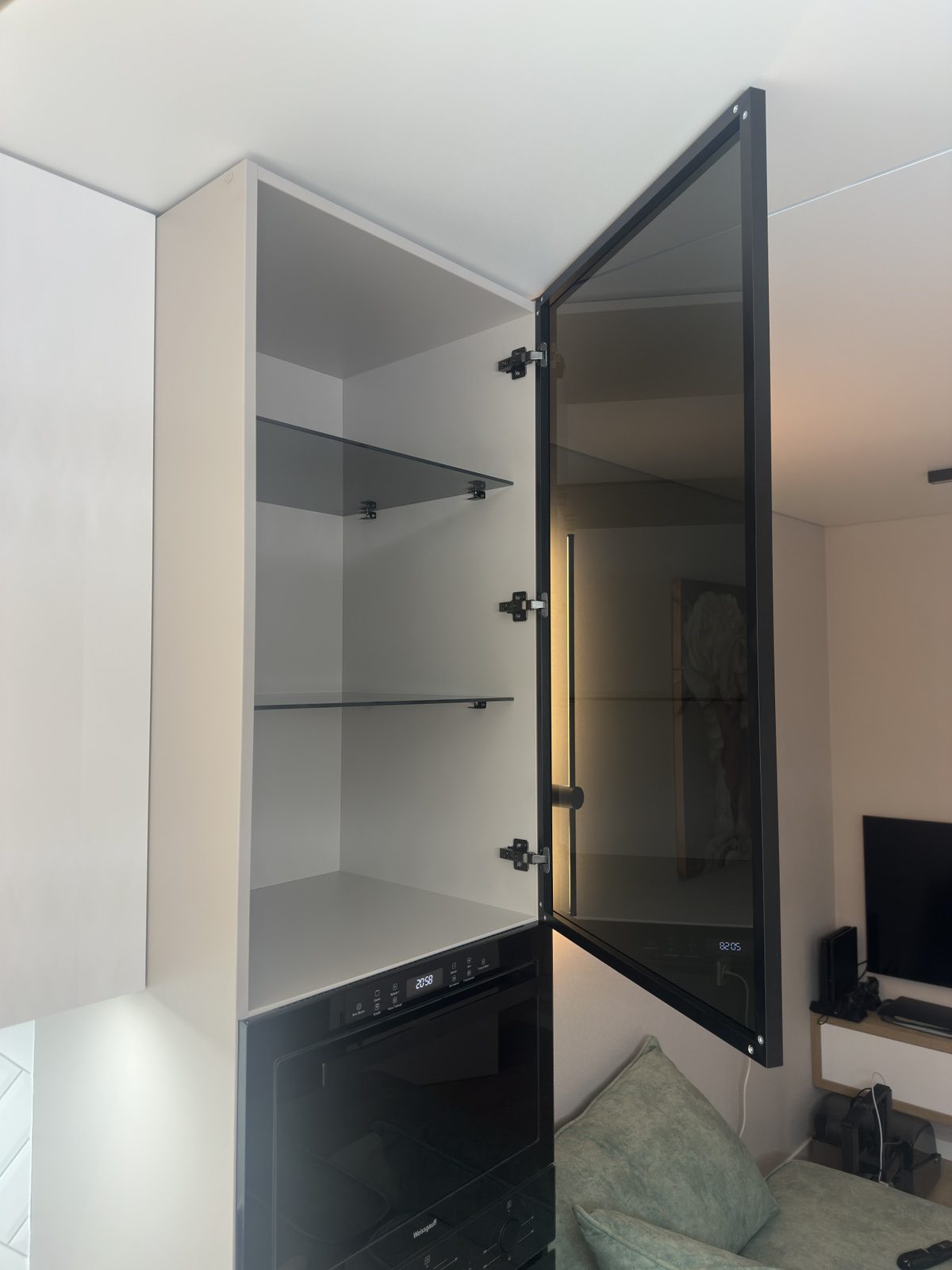алюминиевая дверца фасад в кухне с чёрным стеклом